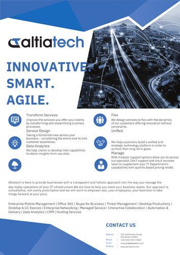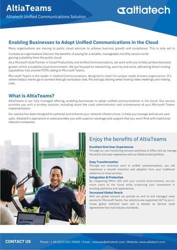AltiaTeams is our fully managed offering, enabling businesses to adopt unified communications in the cloud. Our services include round-the-clock administration and maintenance of your Microsoft Teams implementation.