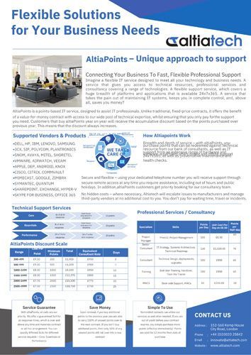 AltiaPoints is a points-based IT service. Unlike a traditional, fixed-price contract, AltiaPoints offers great value for money with access to our wide pool of technical expertise, while ensuring you only pay for the support you need.